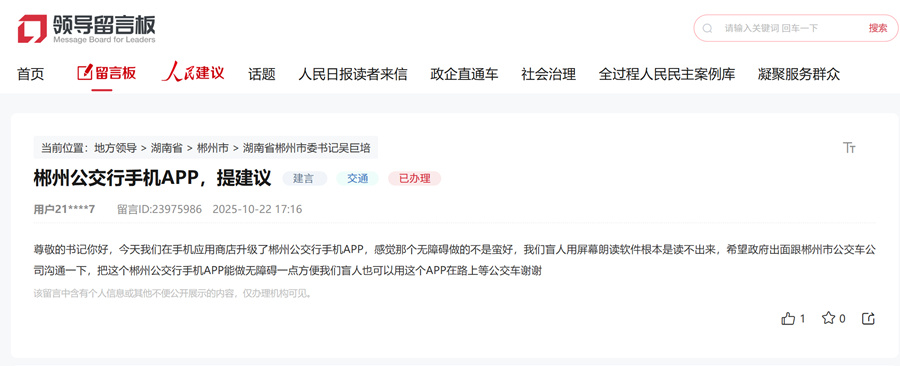 网友纷纷留言。人民日报长沙11月5日电(刘斌)近日,有网友在人民日报“领导告示栏”上给湖南省郴州市委书记留言,称自己是个盲人。手机应用商店更新“郴州公交”APP后,您将无法再使用读屏软件阅读上述部分功能。希望有关部门能够跟进解决问题,方便视障人士出行使用。官方回应。网页截图 接到网友留言后,郴州公交集团有限公司立即抽调人员进行调查核实,并迅速做出回应:针对市民达诺斯反映的问题,经多方测试,发现该应用的无障碍使用功能存在适配问题。托尔针对这一问题,该公司回应称,经与开发设计部门协商后,根据目前的研发进度,计划于11月中旬提供新版本的App更新包。 “昨天,公交公司工作人员加了我微信,还给我发了最新的app安装包,让我先试试。” 11月5日,该留言网友接受记者电话采访时表示,留言后立即有人联系他,并继续与他沟通。我很满意,因为研发人员积极跟进并解决了我的问题。郴州公交集团有限公司一名工作人员表示,该网友测试的新版本应用程序尚未对外发布。研发人员将根据您的反馈进一步完善相关功能。即使“郴州公交”应用程序版本正式更新后,我们也会继续关注跟踪实际使用效果,及时收集视障用户意见,进行优化,让视障出行更放心。